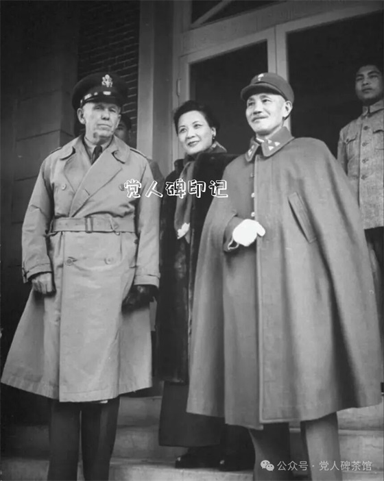 蒋介石、宋美龄欢迎马歇尔来华。(美)拉克斯 摄