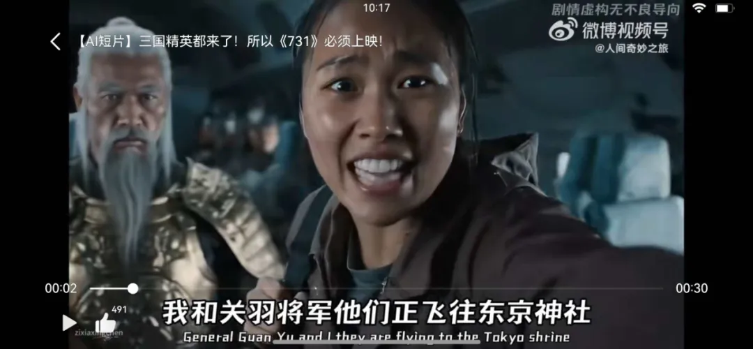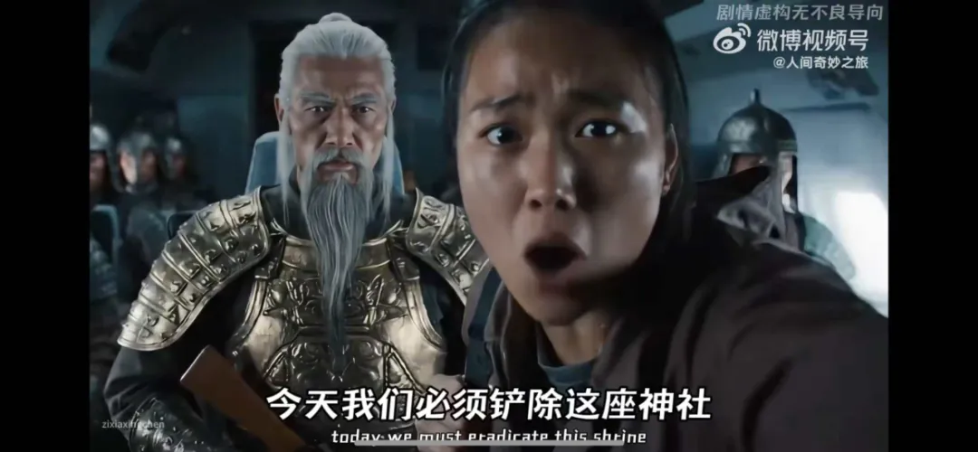 最后,我给大家介绍一部由AI技术制作的短片“三国版灭日”:某年某月某日,中国终于派出了诸葛亮和关羽、张飞,率领大军直捣东京,直捣靖国神社——用短片里的话说:我们必须铲除这座神社!