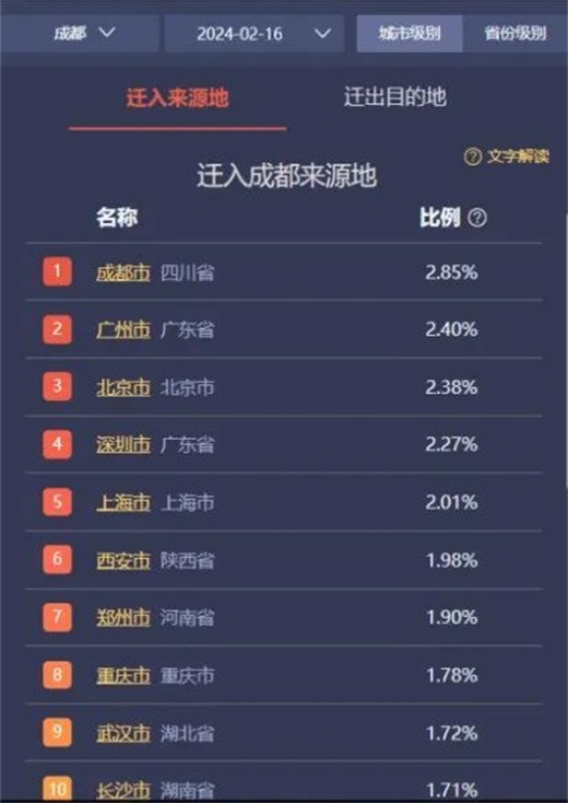 我去看了下成都年后的迁入都是从哪些城市迁入的