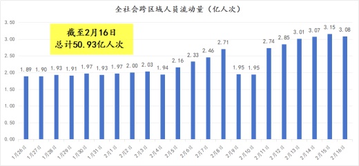 截至2月16日,春运前22天全国累计春运人次已经到达50.93亿人次
