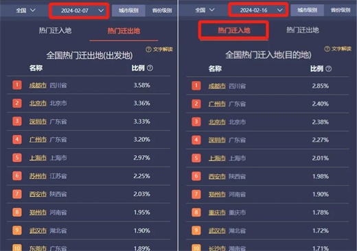 以及2月16日(正月初七)的迁出TOP10城市、迁入TOP10城市
