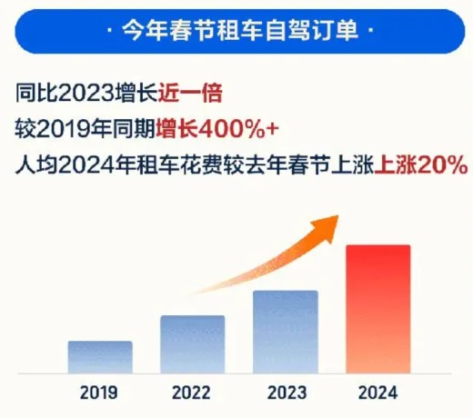 很快携程租车就发布了一份数据,今年的租车订单比2023年增长近1倍,相比2019年涨了4倍