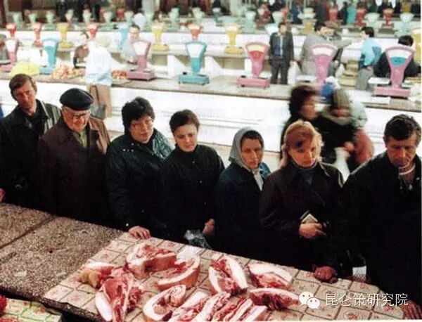 俄罗斯西伯利亚新库兹涅茨克,一个国营市场内,人们在肉摊前排队买肉。1991年,苏联处于严重的经济和政治危机中,几乎所有商品都出现短缺,人们甚至必须大排长龙才能买到生活必需品。