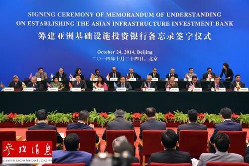 2014年10月24日,包括中国、印度、新加坡等在内22个首批意向创始成员国的财长和授权代表在北京签约,共同决定成立亚洲基础设施投资银行。