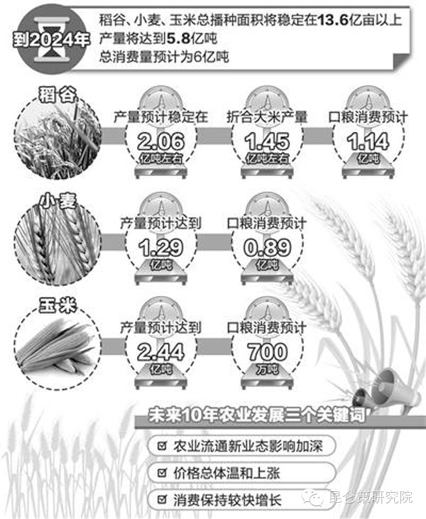 “中国谷物将保持合理自给率,稻谷、小麦两个口粮品种消费自给有余。”报告预测,未来10年,中国谷物播种面积将保持总体稳定,粮食综合生产能力将进一步提升。2024年,中国稻谷、小麦、玉米总播种面积将稳定在13.6亿亩以上,产量将达到5.8亿吨,总消费量预计为6亿吨。其中,稻谷产量预计稳定在2.06亿吨左右,折合大米产量1.45亿吨左右,大米口粮消费预计1.14亿吨;小麦产量预计达到1.29亿吨,小麦口粮消费量预计0.89亿吨;玉米产量预计达到2.44亿吨,玉米口粮消费预计700万吨,饲料消费和工业消费预计保持较快增速,将通过适度增加进口实现供需平衡。
