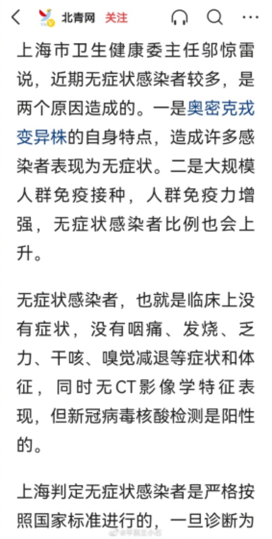 但矛盾的是,魔都卫健委惊雷主任对公众讲的无症状感染者是这样的:临床上没有症状,没有咽痛、发烧、乏力、干咳、嗅觉减退等症状和体征,同时无CT影像学特征表现,但新冠病毒核酸检测阳性。