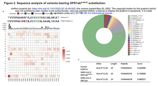为了验证这一假设,他们继续下载了保存在GISAID (https://www.gisaid.org/)上的SARS-CoV-2变异体蛋白。对ORF1a蛋白的1055-1077段氨基酸序列进行了序列分析。在所有SARS-CoV-2蛋白序列中(截至2022年5月10日,共有10541935条),有170条在ORF1ab的1061位点存在丙氨酸(A)到丝氨酸(S)的替换。值得注意的是,这一改变使上述氨基酸序列与人类PARP14^53-59 (3Q6Z_A)相同。