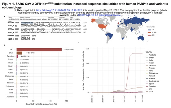 SARS-CoV-2 ORF1ab^A1061S替换增加了与人类PARP14的序列一致性,以及该突变体的流行病学特征。