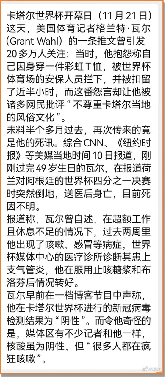 关于他的死因,媒体纷纷报道为死因不明。一个大活人在直播世界杯的时候,突然当着全世界的面倒地猝死,居然说是死因不明。说白了他就是死于新冠,但是为了不影响世界杯的狂热气氛,欧美媒体纷纷指鹿为马。