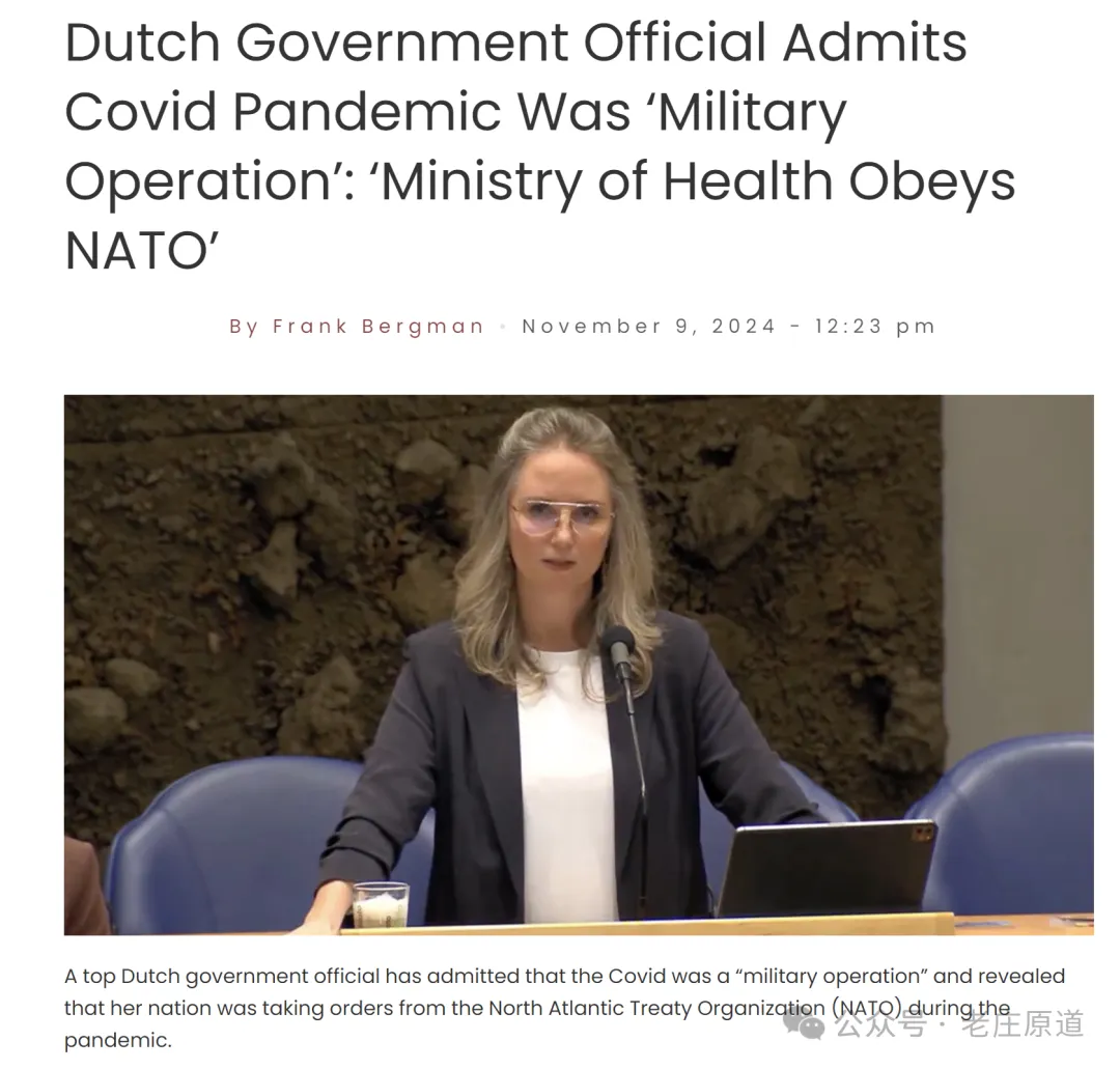 2024年10月24日,星期四,荷兰卫生部长弗勒尔·阿格玛公开披露三年新冠疫情是美国和北约的一场军事行动。当时美国通知了荷兰等北约成员国要求配合,该荷兰卫生部长当年任荷兰国防部长,属于权威的内部知情人。
