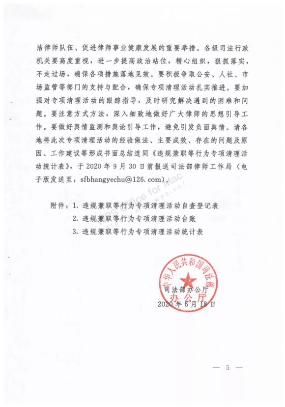 司法部办公厅关于在律师队伍中开展违规兼职等行为专项清理活动的通知