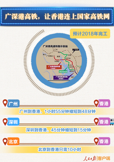 全长142公里的广深港高速铁路将在2018年完工(广深段已建成通车)。届时,高铁将把香港、深圳、广州连接起来。等到高铁通车,广州到香港,只需48分钟;深圳到香港,只需15分钟。