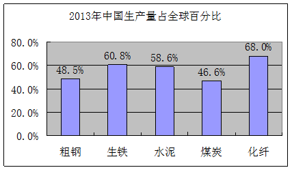 我国的基础工业产品大都在50%左右。如图7所示,2013年我国粗钢产量占全球48.5%,生铁占全球60.8%,水泥占全球58.6%,煤炭占全球46.6%,化纤占全球68%。
