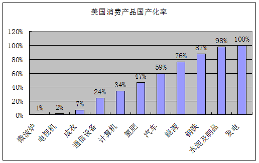 如图6所示,美国消费的工业消费品大都依赖进口,其中微波炉、电视机和成衣等个人消费品基本来自进口,美国国内生产的产品占比例很小。即使对计算机和汽车等高技术个人消费品,美国国产化率也降低到34%和59%了。由于个人工业消费品主要依赖进口,美国国内对基础工业产品的需求量下降,因此,即使工业基础产品生产量年年下降,其国产化率还是明显高于消费品的,其中电难以长距离运输,基本来自美国国内生产,而水泥及其制品价值低,长距离运输的成本高,也主要来自美国国内。另外,美国很多生产量很少的产品,例如手机等,虽然是非常重要的消费品,占个人支出很大比例,由于美国统计局不提供国内产量数据,就无法计算国产化率了,也可以视为基本是进口的。由于难以找到生产量数据,这里还有一些数据是根据产品价值来估算的,如成衣,小汽车,通讯设备等,因美国产品价格明显高于进口产品,从而得出的结果要比按数量估算得到的结果要高得多。