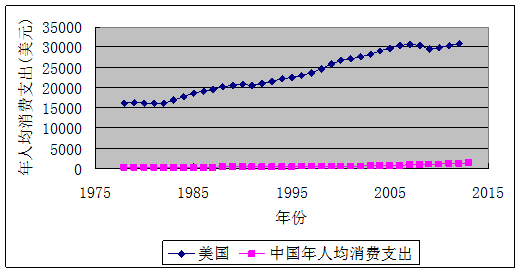世界银行数据库提供的数据是按2005年美元购买力统计的,2012年美国人均消费支出30903美元,中国人均消费支出1221美元,不包括中国在内的世界人均消费支出约5400美元[4],中国人均消费支出不到世界平均四分之一,不到美国1/25。