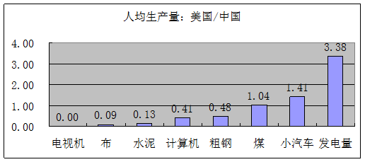 即使比较中美两国的人均生产量,中国在大部分工业产品上的人均生产量也都超过了美国。如图5所示,相比中国人均生产量,美国人均生产的布、电视机和水泥基本可以忽略不计了,粗钢仅相当于中国人均生产量一半,计算机等于中国人均生产量五分之二,除能源领域外,只有小汽车生产量超过中国40%。由于无法让中国人生产电力,美国人消费,美国人均生产电力仍然是中国人均生产量的3.4倍。也就是说,虽然美国人均消费比中国人均多几十倍,但是,中国人均生产量,虽然不是全部产品,但在工业消费品方面,大都是美国人均生产量的数倍到数十倍。
