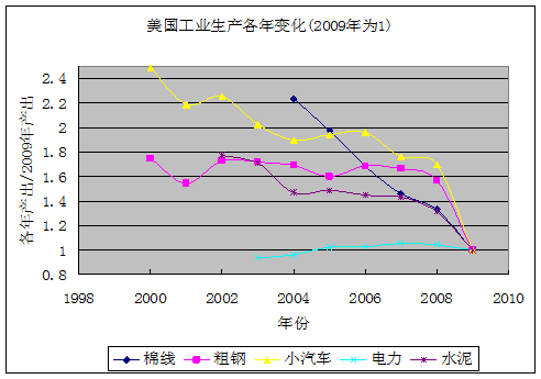 另一方面,美国工业生产年年萎缩,工业消费品大都依赖进口,而工业基础产品的生产也严重不足。如图3所示,以2009年为1,主要产品,除能源工业以外,各种工业生产都是逐渐减少,仅仅经过5-10年,大部分产品生产量都下降了一半左右。2004年棉线生产量是2009年2.24倍,2000年粗钢生产量是2009年1.75倍,2000年小汽车生产量是2009年2.5倍,2002年水泥生产量是2009年1.77倍。不仅仅在危机期间发生生产减少,而是在正常年份就不断减少。只有电力,难以远距离运输,尤其无法越洋运输,只能自己生产消费,与美国居民的终端消费一起增加。