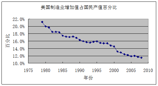 图9 美国制造业增加值占国民产值百分比 1979-2008