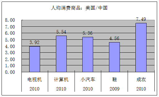 从人均消费的工业消费品来看,虽然差距没有收入那么大,但也非常大,如表1和图2所示,美国人均消费是中国人均消费的4-7.5倍。其中2010年美国人均消费的成衣达到了惊人的65件,等于一个人每5-6天买入一件新衣服,同时扔掉一件“旧衣服”。网上有人介绍,有的美国人买来很多衬衣,只穿一次就扔掉,因为拿去洗太麻烦了,虽然美国都是用洗衣机洗衣服,从没有手工洗衣的。这里我们没有分析美国和中国工业基础产品的人均消费量,这是因为很多工业基础产品都是工业消费品的原料,很大部分的实际最终消费者是消费工业消费品的消费者。例如,钢铁是生产家用电器,计算机和小汽车的主要原料之一。