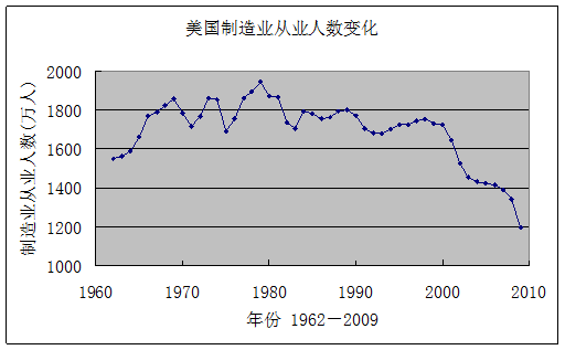 根据美国奥巴马总统报告[25]提供的数据,从1962年到2009年,美国制造业从业人数变化,如图11所示,六十年代初,人数是逐步增加的,到六十年代末,就有减少的年份了,此后,一直到2000年,美国制造业人数一直在1800万左右徘徊,此后,美国制造业从业人数就一路下滑,仅过了9年,到2009年的时候,就下降约三分之一,降低到不足1200万了。考虑到生产效率的不断提升,可以说,从1962年到2000年,美国的制造业还是在不断增长的,而最近几年从业人员的快速下降,对应了美国制造业的日渐萎缩。