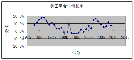 美国和西方的去工业化和产业空心化是西方学术界和主流媒体的热门话题。从美国制造业产值占国民产值百分比来看,如图9所示,从1979年到2008年一直是逐步下降的,到2008年,美国制造业下降到只有11.5%。其中有三个较快的下降时期,分别发生在80年代初,九十年代初和本世纪初。最近一次快速下降,与美国同意我国加入世界贸易组织,进入美国市场,代替美国生产有关;90年代初的快速下降,与苏联解体带来的军事支出下降有关;而80年代初的下降,与中国停止支持第三世界国家反抗美国有关,美国当时的军事支出也明显下降了。如图10是美国军费年增长率,80年代中期和九十年代初出现两次大的下降,特别是九十年代,除1992年因入侵伊拉克而大幅度增加军费外,几乎年年军费下降,分别对应的是中苏两国的政治巨变。而在21世纪初,美国军费又一次出现了大的增长,对应的是美国在阿富汗伊拉克等地的侵略行动。但这次增长,与中国低价贱卖大量出口同步,代替了美国制造业,从而不影响美国制造业在此期间的持续下降带来的负面影响。我国的出口,大多来自制造业,从2000年出口2492亿美元增加到2009年12016亿美元,差不多增长了5倍。