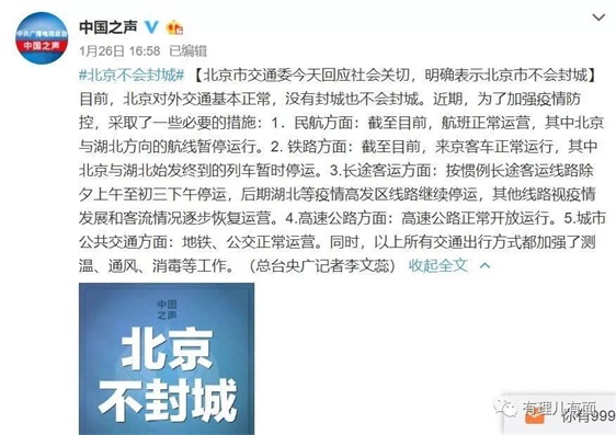 定神一看,这是一个发布于1月24日的视频,也就是3天前。该中年大叔就“预言”北京即将戒严?都3天了“即将”应该实现了吧。千万级人口的城市戒严了,怎么我这个热爱上网的网虫会不知道?和北京朋友联系一问,交通正常、日常供应正常,和平常有区别的,就是大家出门都自觉戴了口罩。再看看微博,官宣白底黑字写着“北京不会封城”,啪啪啪打脸。