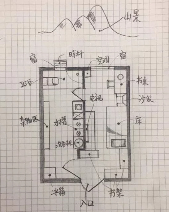 没有飘窗,没有衣帽间,没有阁楼,没有专门的储物间……,下面是还原了户型布局的手稿图: