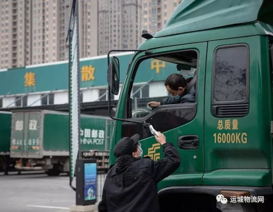 2月1日,武汉邮区中心局,工作人员为邮车司机测量体温。中青报·中青网记者 李峥苨/摄