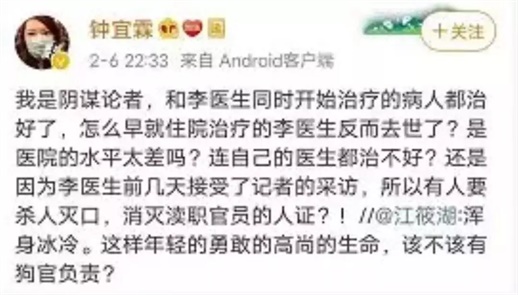 但是,你知道,很多人已经开始拿李文亮医生的死,在大做文章,表达自己的诉求,有人称他们为“八君子”,有人要为他修纪念碑,就在李文亮医生去世的那个凌晨,谣言四起,比如: