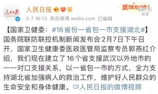 截至昨天,全国共有107支医疗队,10596名医疗队员支援湖北省医疗救治工作。几乎全中国的医疗精英们,都云集湖北。而全国各省直辖市,都要对接整个湖北,“一省帮一市”。这是在用举国之力,帮助湖北抗击疫情。