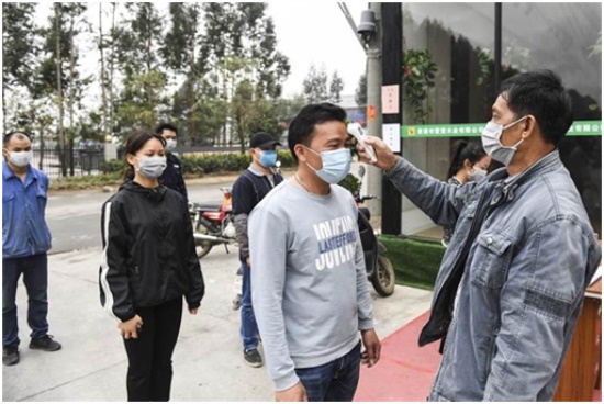 企业复工复产必须依照规定的程序与防疫要求,这是广西贵港企业工人在上班前进行例行体温检测。