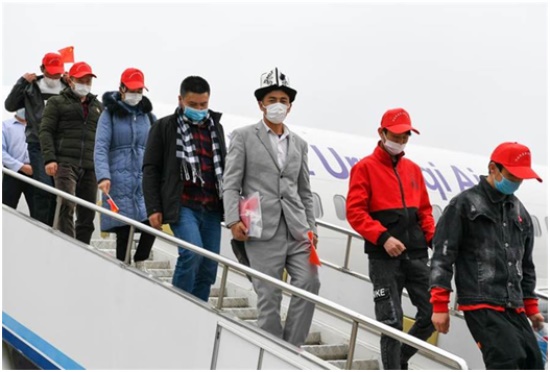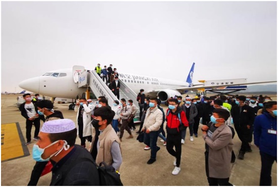 江苏无锡包机到新疆接员工复工,包机抵达无锡苏南硕放国际机场后,员工再乘坐包车至企业免费宿舍,做好防护、隔离之后,按各项防疫要求上岗。