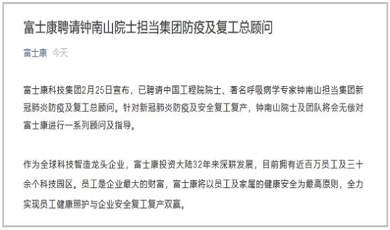 除了上述方式,有些地方还直接发“复工红包”,员工一到未上班就先发钱,上班后承诺再加发奖金,如广东省中山市对积极复工复产且落实好疫情防控措施的企业,复工就每人发300元红包;浙江省义乌市对复工复产员工提供补助与免费食宿或补贴交通费用,此外,为企业介绍新人则提供多种补助与奖励金。还有更特别的,据富士康科技集团官方公众号消息,富士康科技集团2月25日宣布,已聘请中国工程院院士、著名呼吸病学专家钟南山担当集团新冠肺炎防疫及复工总顾问,针对新冠肺炎防疫及安全复工复产,钟南山院士及团队将会无偿对富士康进行一系列指导。见图: