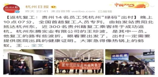 还有政府直接出面掏钱安排复工的。杭州市规定,不得以外地车牌、外地户籍为由限制进入,对没钱租房屋住的企业员工,政府给予每人500元的租房补贴;海宁市指导企业包车、包机、包专列,接新老员工返岗,政府补2/3的路费;义乌市对于重点地区、重点企业的员工,由政府组织专车、专列、专门车厢负责接送,费用全部由政府买单。下图为杭州的全国首趟复工专列报道:
