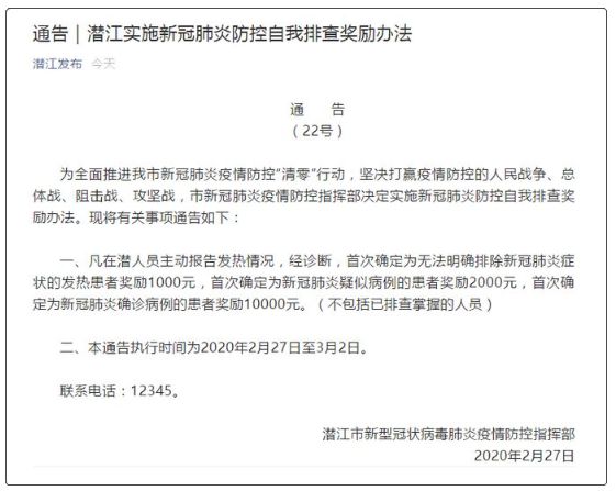 美国让疑似患者都待在家里“自求多福”,中国潜江市举措是,凡在潜人员主动报告发热情况,经诊断,首次确定为无法明确排除新冠肺炎症状的发热患者奖励1000元,首次确定为新冠肺炎疑似病例的患者奖励2000元,首次确定为新冠肺炎确诊病例的患者奖励10000元。