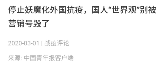 国内疫情基本得到控制,国外疫情刚刚爆发之际,中国青年报客户端发表了曹林的文章《停止妖魔化外国抗疫,国人“世界观”别被营销号毁了》: