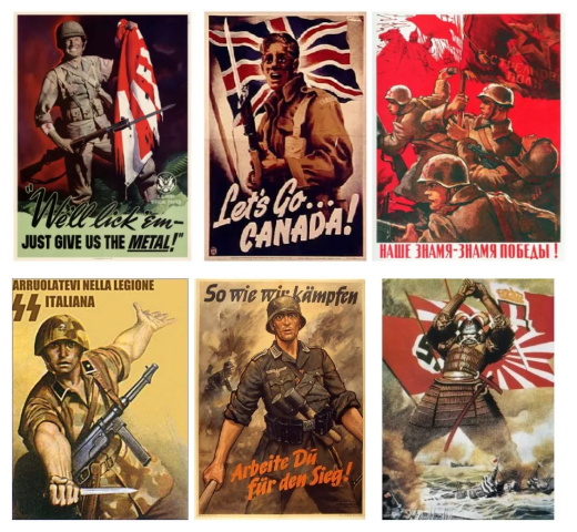 看一看二战期间各国的宣传画,听听当时的宣传歌曲和宣传段子,就会发现,德国、日本,苏联、英美,所采取的手段只有文化背景的差异,而并没有本质的区别。