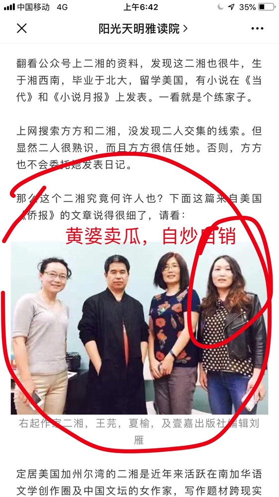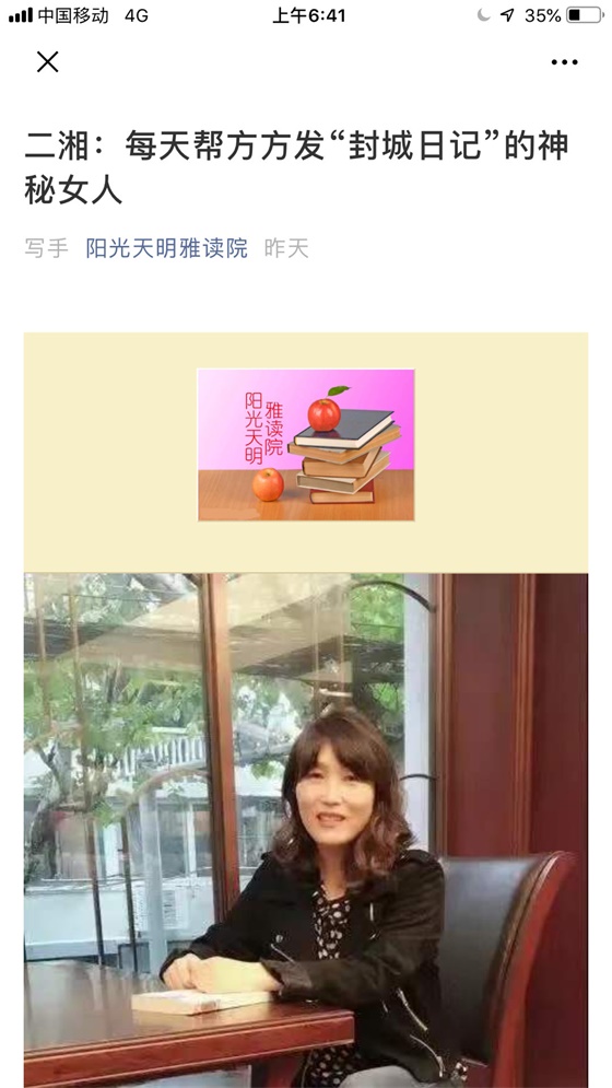 她是方方《武汉封城日记》背后的女人,她不予余力的借助方方热度成全自己,并且还有几个私流量公众号都在宣传二湘,二湘也成了一个网红。