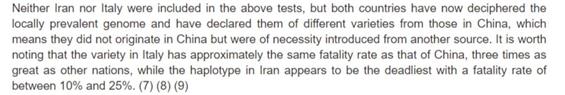 翻译:上述测试均未包括伊朗和意大利,但两国现已公开了当地流行的基因组,并宣布它们与中国的基因组不同,这意味着它们并非起源于中国,但肯定是从其他来源引入。值得注意的是,意大利的病死率与中国几乎相同,是其他国家的三倍,而伊朗的单倍型似乎是最致命的,病死率在10%至25%之间。