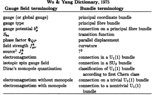 杨振宁: 1975年,吴大峻和我发表了一篇文章,内容是物理学家的电磁场理论,以及它和数学家的纤维丛理论(Fiber Bundle Theory)之间的关系。为了说清楚这两个理论之间深层次的相互关系,我们建立了一个二者之间的名词对照词典。1976年,伊莎多尔·辛格(Isadore Singer)刚好到纽约州立大学石溪分校访问,我就把这篇文章拿给他看。他把这篇文章带到了牛津,给迈克尔·阿蒂亚(Michael Atiyah)和其他的数学家看。他们都对这篇文章很感兴趣,并且开始研究规范场理论相关的数学问题。结果是,在接下来的一段时间中,数学家和物理学家之间开展了很多非常紧密的合作。我想,在这两个学科的长期历史中,这都是一个有重要意义的事件。1988年,辛格在一篇关于外尔的文章中回顾了这段故事。下面是辛格在文章中引用的吴-杨词典:
