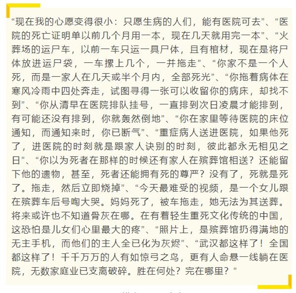 救灾中有人死了,当哭;但如果有人得救了,是不是当笑?如果死的比得救的多,哭声大很自然。如果得救的人是多数,笑声大是不是也很自然?新冠病毒灾难中死的人多还是得救的人多?有理由哭的人多还是有理由高兴的人多?但方方说不行,“天大地大不如我这灰尘大”,我不高兴别人也只能都哭丧——“死亡者似乎离自己越来越近。邻居的表妹死了。熟人的弟弟死了。朋友爹妈和老婆都死了,然后他自己也死了。人们哭都哭不过来”、“疫情过后,将有几千人家同时办丧事,那些日子,该怎么过?那将又是一次巨大的集体性的创痛”、“武汉都这样了!全国都这样了!千千万万的人有如惊弓之鸟,更有人命悬一线躺在医院,无数家庭业已支离破碎。胜在何处?完在哪里?”——那么多人得救,难道不算胜利?难道不许高兴?因为战争有伤亡,所以胜利了也不算胜利,只能算成失败,不许庆祝胜利,只许吊丧哭丧;因为疫情有人病死,所以战胜疫情挽救了多数人也不算成功,只许算成失败,不许庆祝胜利,只许吊丧哭丧——这是什么逻辑?