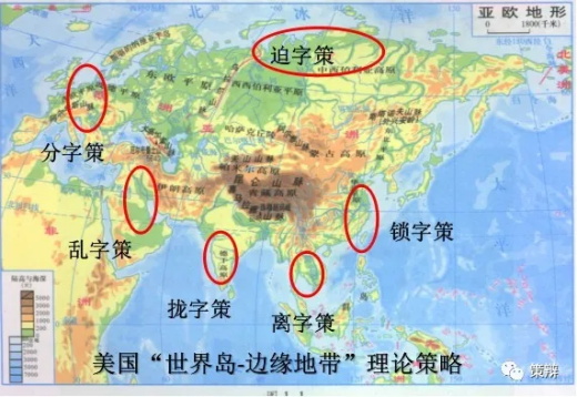 美国根据自家战略家马汉的海权论,得出了要控制世界16个咽喉水道,于是其在全球布局,控制世界最重要的16个咽喉水道。根据自家战略家斯皮克曼的边缘地带学说,针对性的在具备潜力实力的“边缘地带”势力周边,施展针对性的策略,前文有详述,策辩将其美国策略转换为下图了: