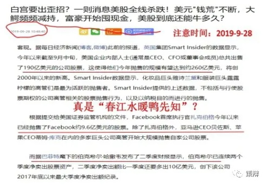 不是如此,这场演习不会持续时间这么长、涉及部门领域如此广;不是如此,神通广大的基金会与美商界精英,不会在演习评估报告出来后,马上组织推演,研讨商界应对方案;不是如此,美权贵(参议员2月抛售股票)和大富豪(2019年9月开始持续抛售股票;当时人们普遍判断只是大富豪们基于市场信息而采取的策略,详见下面信息插图)提前套现;自然,不是如此,纽约时报不会在把演习方案和新冠现实疫情对比后,感到“不寒而栗”!因为,演习推演优化后的方案,已在进行中!正如两场内窥演习后的两场伊拉克战争一样。