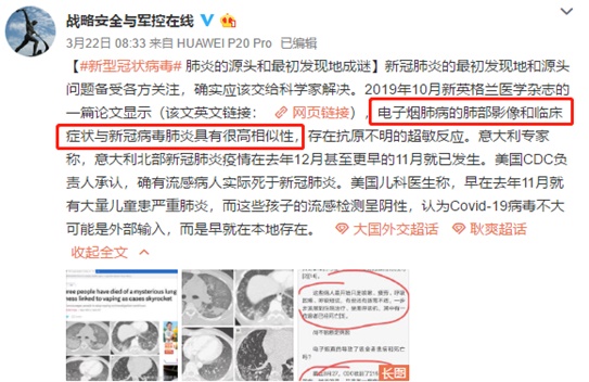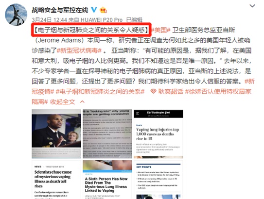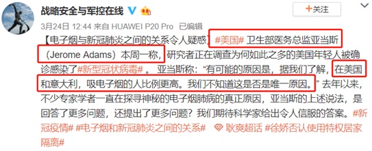 3月24日,中国外交部军控司日前发布微博称:电子烟肺炎与新冠肺炎之间的关系令人疑惑。