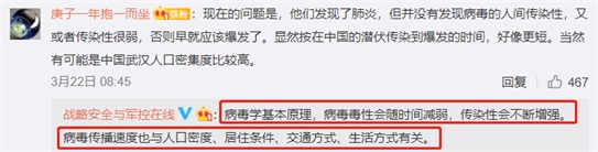 军控司在网友的留言下也做出了解释:根据病毒学基本原理,病毒毒性会随时间减弱,传染性会不断增强。病毒传播速度,也与人口密度、居住条件、交通方式、生活方式有关。