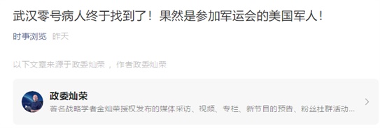 部分图片资料来自外交部军控司官方微博政委灿荣:《美国人追查到疑似新冠肺炎零号病例,军运会女选手!@特朗普请你解释一下!》魔都囡:《瓜越吃越大!外交部开吃!病毒源和美国到底有无关系?》