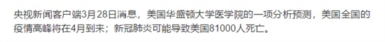 更恐怖的是,华盛顿大学的分析预测显示:美国疫情高峰将在4月到来,可能导致81000人死亡。