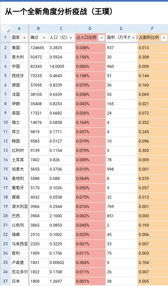反观中国,无论是确诊病例占人口比重,还是每平方公里冠状病毒感染人数,都是各国偏低的。大数据指出来的趋势不言而喻,我,挺中国!