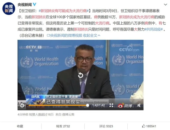 3月9日,世卫组织总干事谭德塞表示,当前新冠肺炎疫情已在全球100多个国家和地区蔓延,病例数已突破10万。