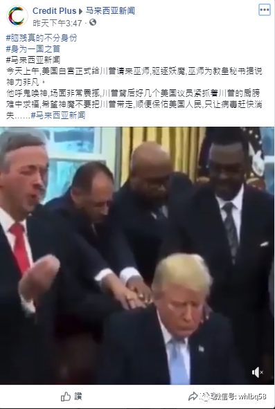 该视频由《马来西亚新闻》于13日下午3点47分在脸书上发出,该脸书文写道:“今天下午,美国白宫正式给川普请来巫师,驱逐妖魔。巫师为教皇秘书,据说神力非凡。他呼鬼唤神,场面非常震撼。川普背后好几个美国议员紧抓着川普的肩膀难中求福,顺便保佑美国人民,只让病毒赶快消失……”
